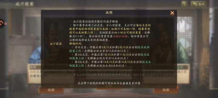 本赛季共三位文臣,分别是陈群、程昱、钟繇,每位文臣有6个提案,玩家可以从每个文臣的6个提案里面选2个提案使用,提案采纳后48小时可以重置,消耗50金珠。18项提案包括军事、内政、扩张等方向,玩家可以选择最喜欢的提案来享受加成。