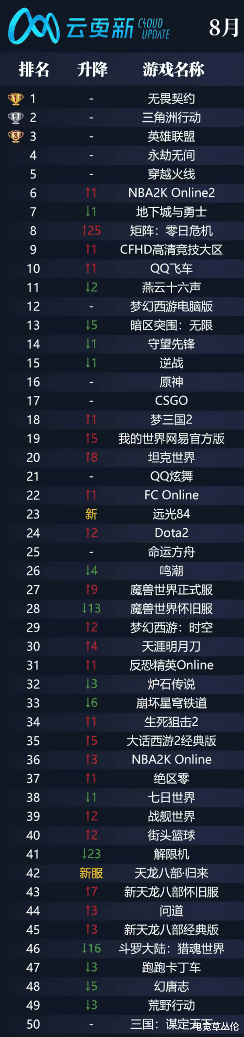 如果说精灵AI的榜单像一台“慢镜头摄影机”,把在线时长、并发人数、社交互动全部纳入算法,那么云更新则更像一台“高速连拍相机”,用每一次点击启动的瞬间捕捉玩家最真实的冲动。在这份以“启动次数”为唯一指标的云更新热度榜中,《无畏契约》一举反超,直接登顶。