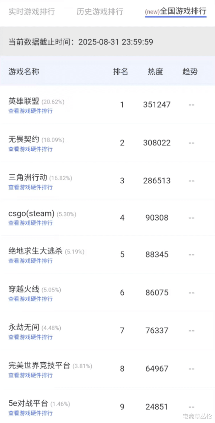 随着暑假的钟声缓缓落下,中国端游市场却像被按下了加速键。精灵AI全国网吧游戏实时数据,截至8月31日,《英雄联盟》以20.62%的热度占比和超过35万的绝对数值继续盘踞榜首;紧随其后的是《无畏契约》,它以18.09%的占比、突破30万的热度值,牢牢锁定第二名,并确立了自己在FPS赛道的王者地位。两大平台、两个维度,却指向同一个结论:MOBA与FPS依旧是网吧流量的双引擎。