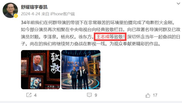 9月16日,有网友发帖告知演员王志成不幸离世,目前这条消息已经得到多方确认,演员舒耀瑄也曾公开缅怀,可以得知,王志成去年就已离世,因为太过低调,以至于消息没公开。