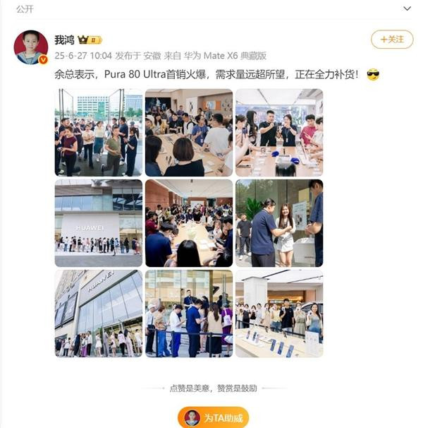 快科技6月27日消息,华为Pura 80 Ultra首销引发广泛关注,开售后迅速被抢购一空。根据博主晒出的图片,华为线下门店人山人海,市场需求远超预期。