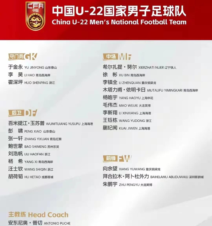 中国男足U23名单如下:以中超球员为主,中甲球员为辅。