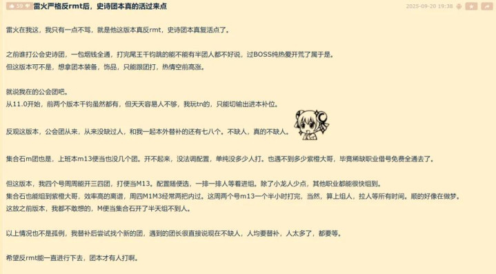 最后谈一下雷火压根打击GZS的好处,最直观的表现就是正常的团本活动复活了。有玩家表示,以前公会组织活动非常困难,就连最简单的便当团都没人打,更不要说开荒尾王了。