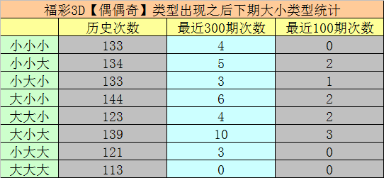 一、福彩3D上期奖号为045,大小类型开出:小小大,历史上该大小类型奖号共出现1041次,最近7次【小小大】奖号分别开出:007、108、439、125、419、406、408,其中组三号码出现1次,组六号码出现6次。