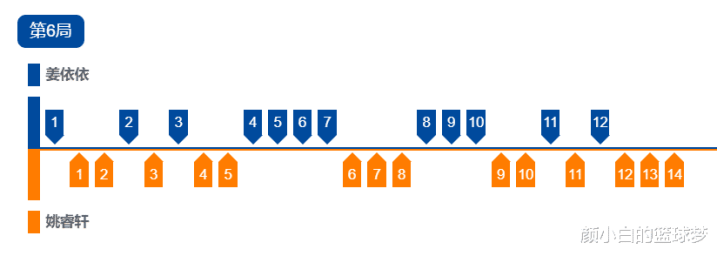 这场比赛最精彩的实际上就是第六局,这一局对于姜依依来说是悬崖边她拼的很厉害,开场姜依依3-5落后,她随即连拿4分反超,姚睿轩又连拿3分,姜依依一波3-0后她10-8率先拿到局点。