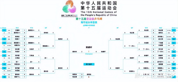 全运会女单U18青年组决赛,河北队的姚睿轩4-2击败山东队的姜依依夺冠,六局比分:7-11,11-5,11-6,8-11,11-2,14-12。姚睿轩在0-1落后的情况下连赢两局,姜依依扳成2-2后姚睿轩单局11-2拿下天王山,最终第六局关键分拿下。