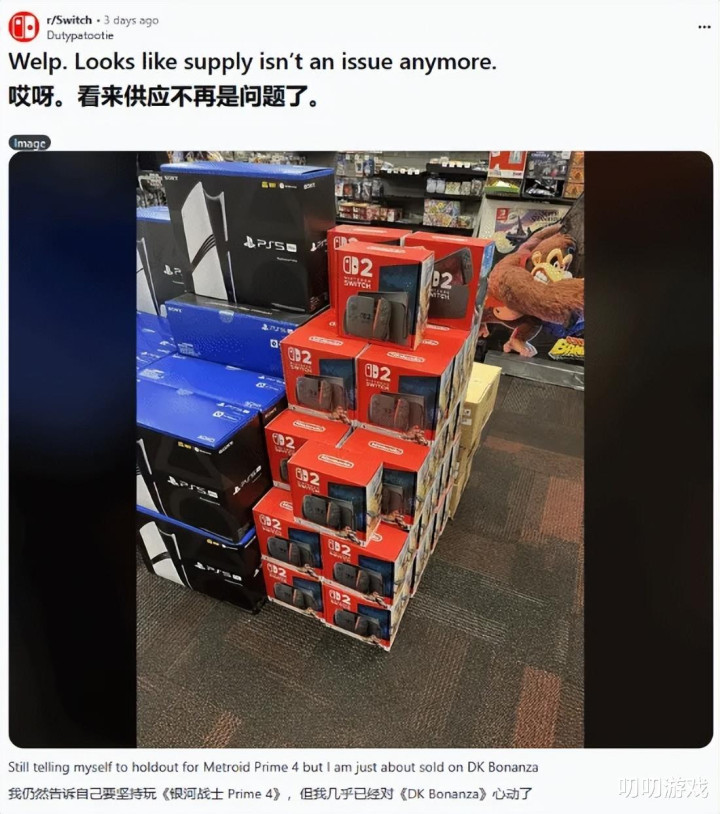 随着Switch2产能的增加,有玩家晒出商店堆积成小山的Switch2,发文称看来Switch2供应已经不成问题了。