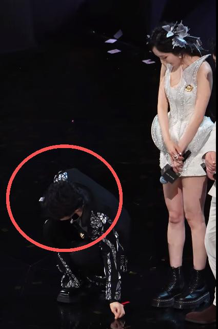 而周深蹲下去捡彩带,避免不了的就会看到镜面上的反光。