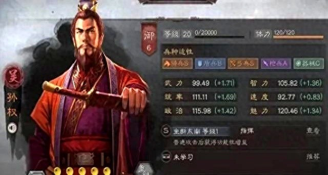 新版本调整后,他的自带战法“坐断东南”触发更稳定,配合周泰的增伤和马婵的爆发,能在前几回合就打出压制效果。