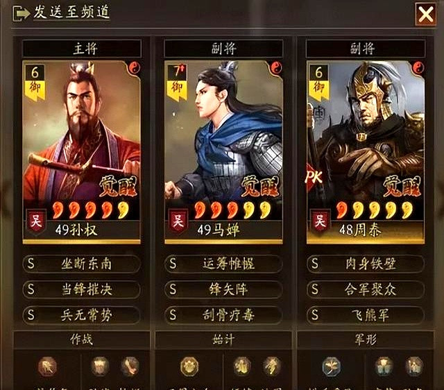 战法选择上,孙权带“当锋摧决”和“兵无常势”,马婵用“速乘其利”和“暴戾无仁”,周泰则带“锋矢阵”和“抚辑军民”。